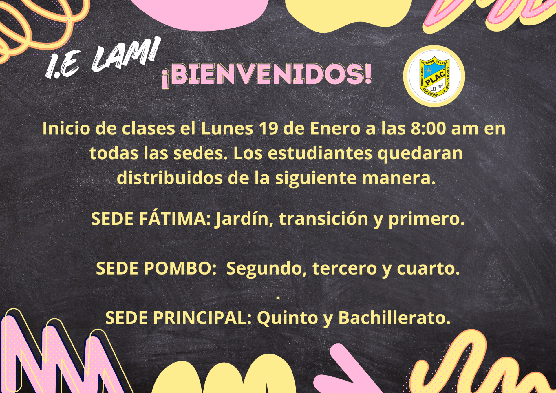 En la I.E La Milagrosa nos llena de entusiasmo recibir a nuestros estudiantes el próximo Lunes 19 de Enero a las 8:00 am en todas las sedes. Queremos compartir con ustedes que dentro de los cambios que se están llevando a cabo en nuestra institución tenemos la redistribución de los estudiantes de la siguiente manera: